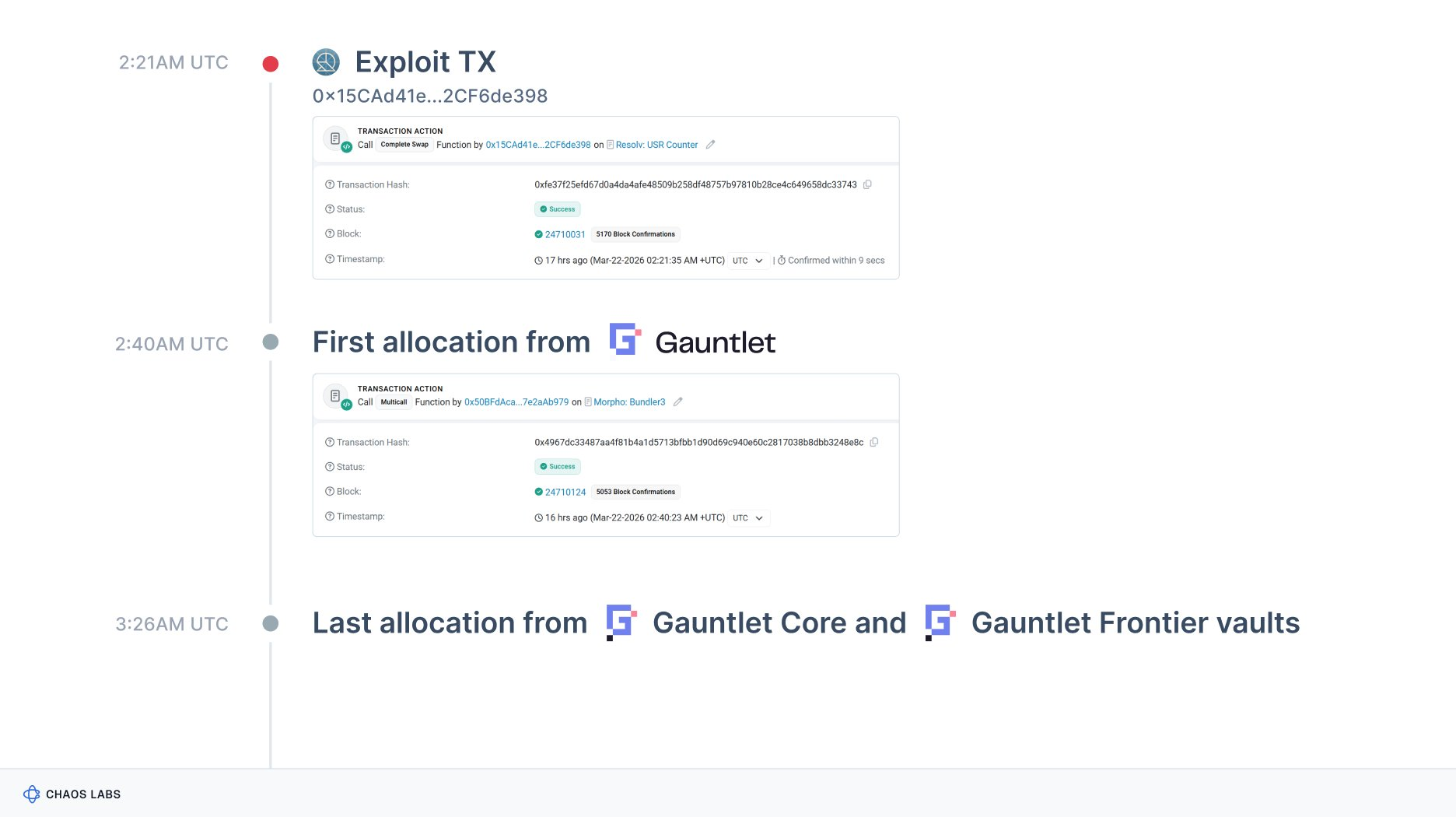 Each new allocation increased the amount of USDC available to be borrowed against impaired collateral, effectively extending fresh exit liquidity to an attacker draining the system. Here’s an ongoing tally of exposures as of 1pm EST, March 23rd: