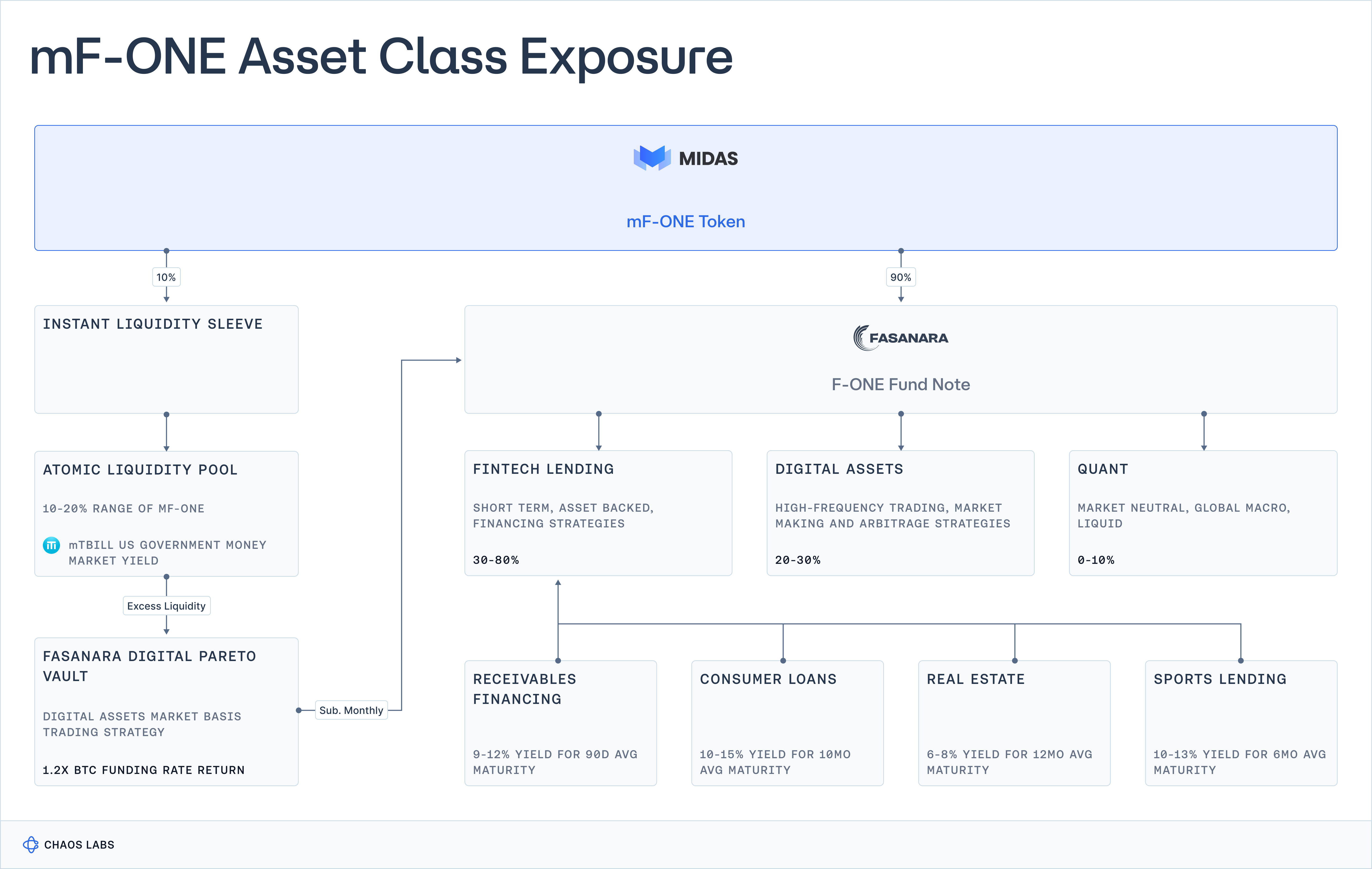 F-ONE targets sub-15% annual returns through a portfolio weighted primarily toward fintech lending, alongside consumer loans, real estate bridge financing, sports receivables and digital-asset arbitrage. The strategy employs leverage of about 1.3-1.5x. Importantly, mF-ONE embedded additional liquidity layers to its underlying fund exposure, including:
