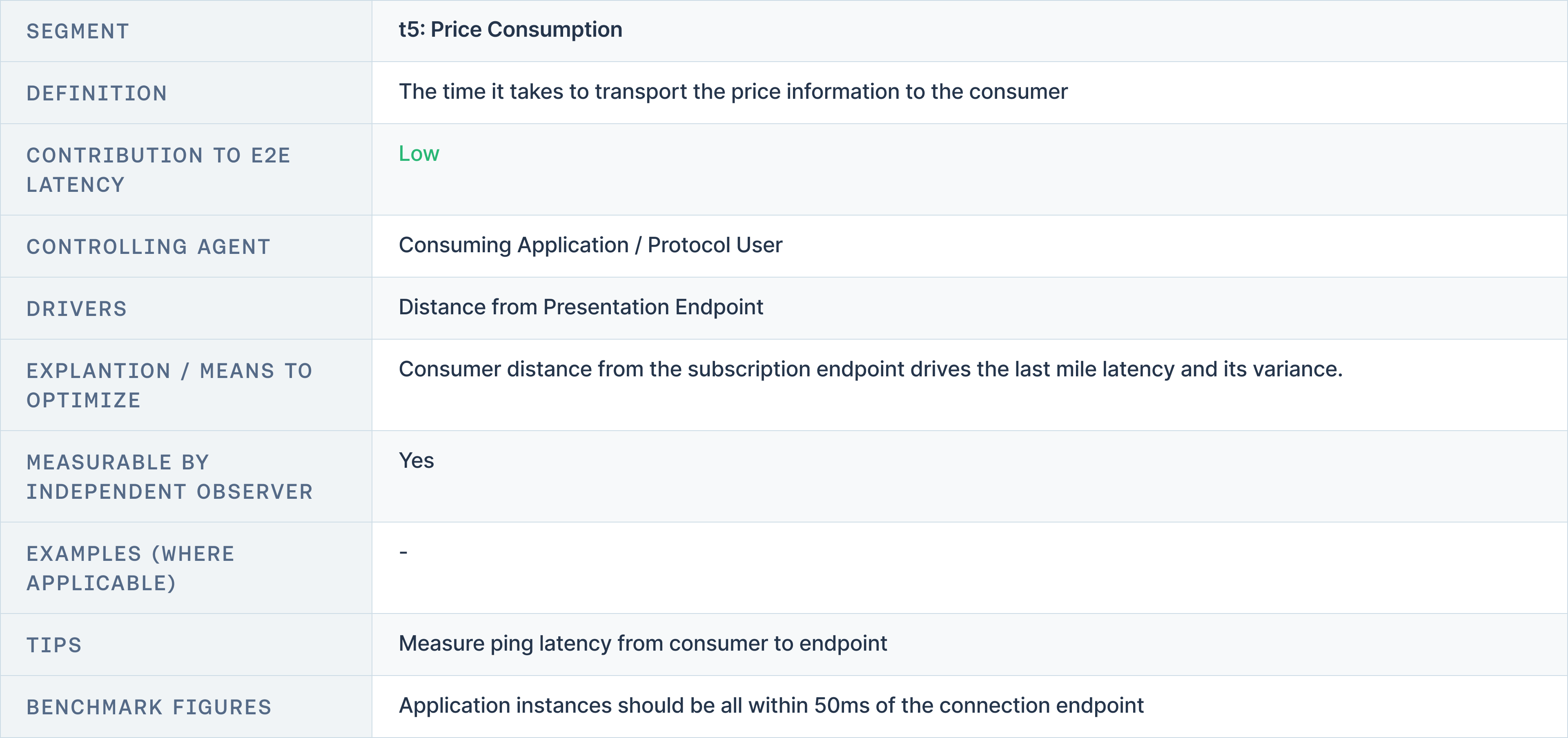 - t5: Price Consumption Latency, the final stage where data is delivered to the end-user or application.