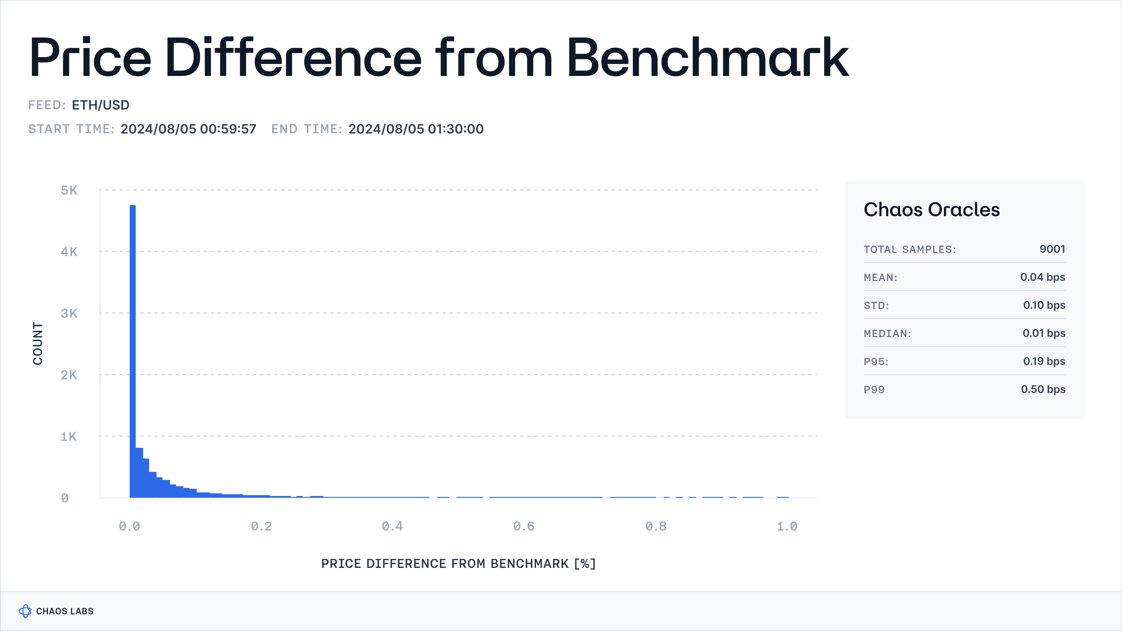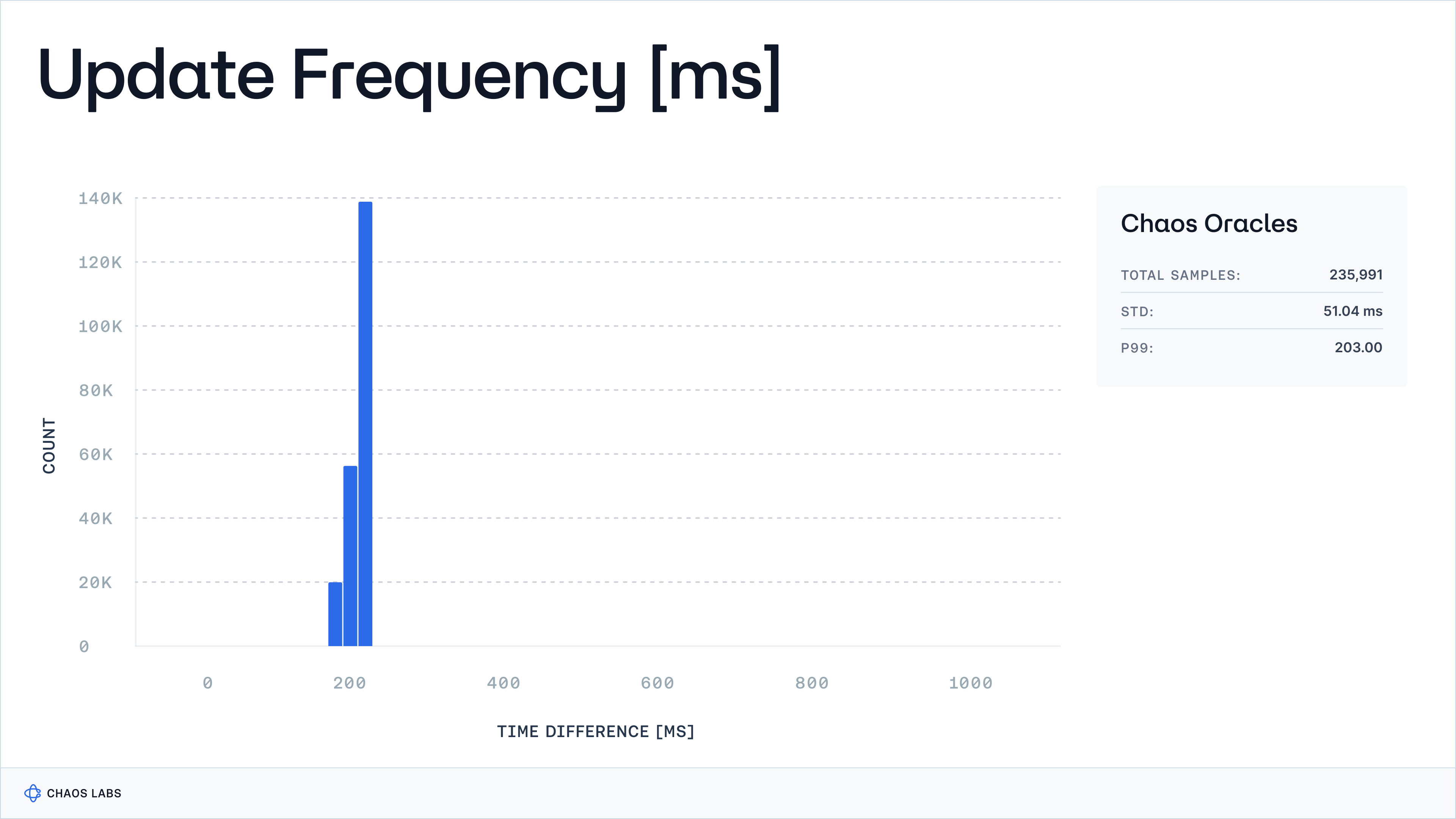 The chart below illustrates the time distribution between consecutive observations for Edge, Chaos Labs’ Price Oracle. This visualisation helps assess how quickly Edge responds to market changes. The chart highlights Edge's responsiveness, consistently updating approximately every 200 milliseconds (p99). This frequency level ensures the data remains timely and relevant, supporting real-time decision-making in dynamic market conditions.