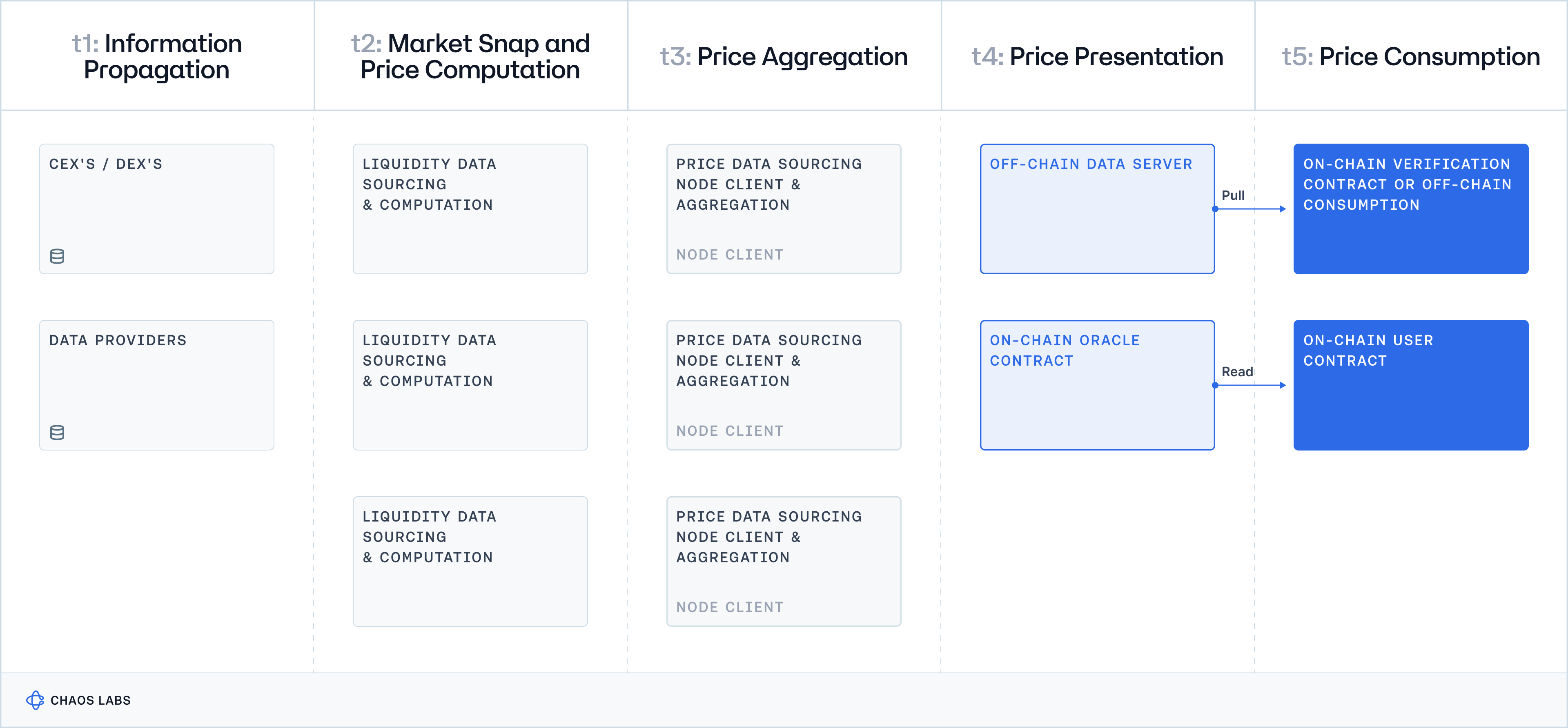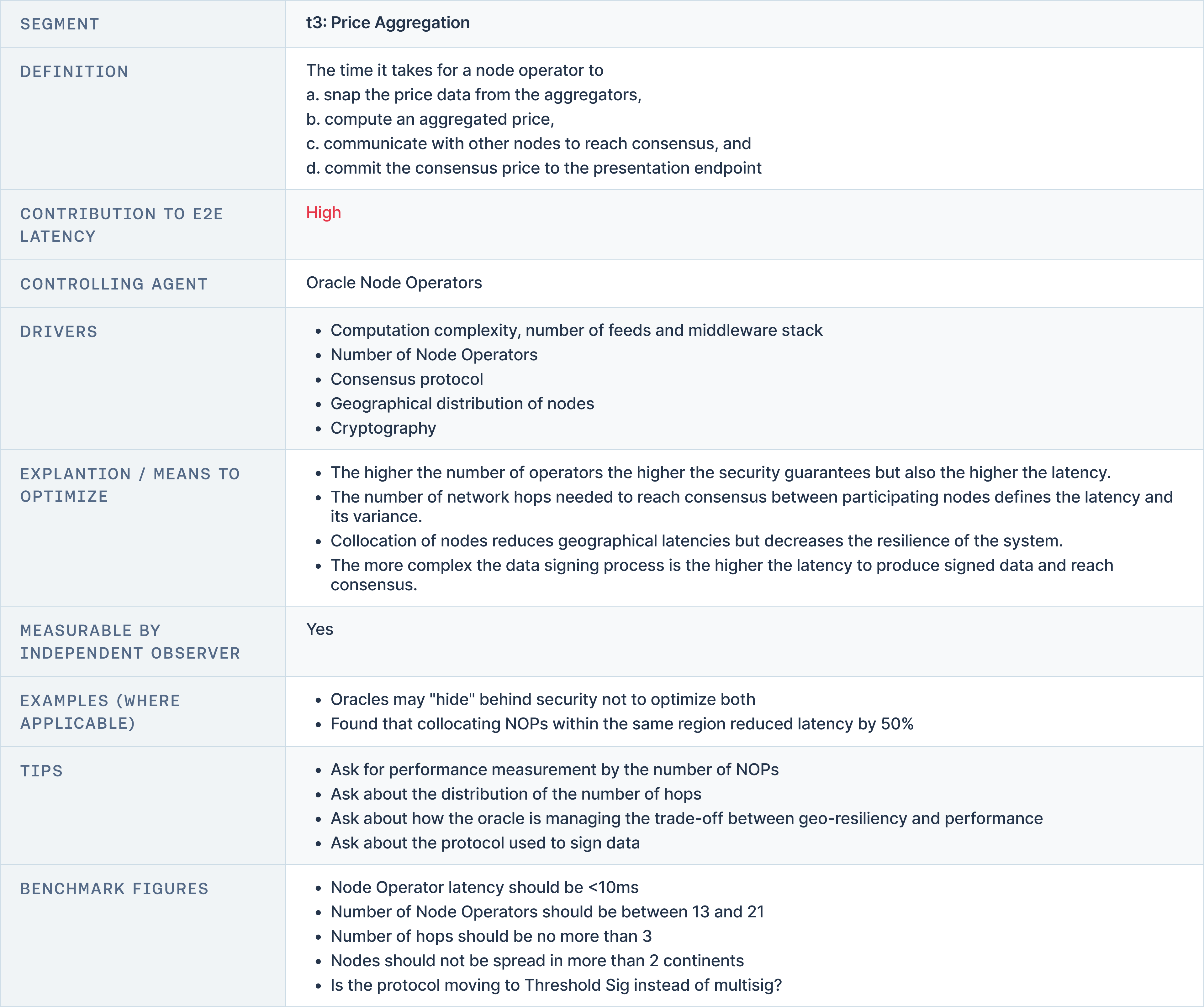 - t3: Price Aggregation Latency, involving the synthesis of data from multiple oracles.