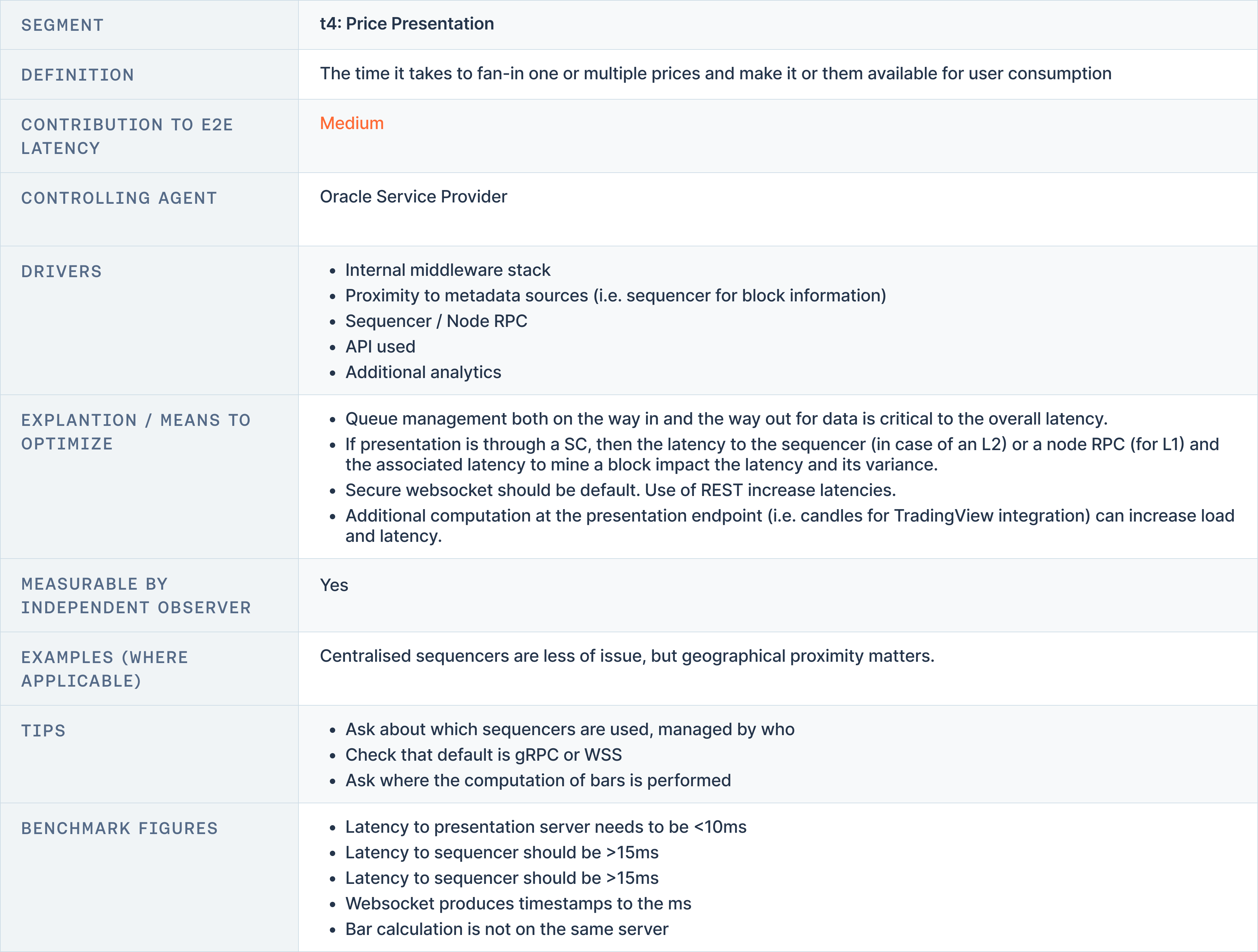Price Presentation Latency represents the time it takes to display processed price data to the end user. This latency is influenced by the Oracle provider's internal middleware and queue management systems. Inefficiencies in this process introduce latency as data is prepared for end-user consumption.