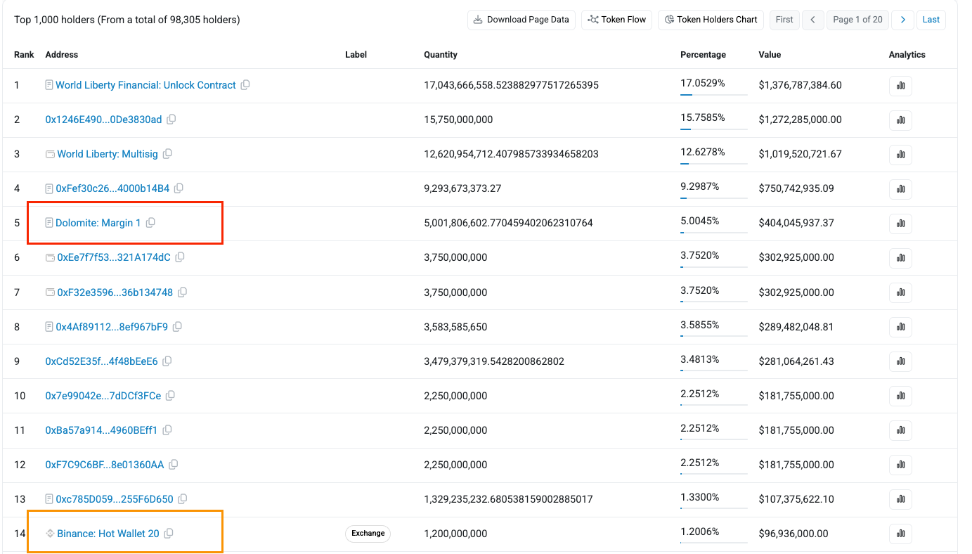 World Liberty Finance accounts for 82.7% of total TVL supplied to Dolomite and 85.3% of total assets borrowed. In practice, activity is highly concentrated: collateral is supplied by the same entity driving borrowing, and liquidity is largely recycled across the same set of addresses.